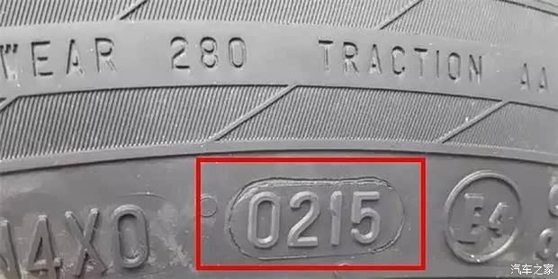 轮胎上的生产日期不像平常的一些产品标明某年某月某日生产,而是用一个四位数说明。这个四位数也和我们正常思维理解的不一样,它是倒过来理解的:后面两位代表的是年份,前面两位代表的周数。如下图所示的0215,代表的就是2015年第二周生产的。