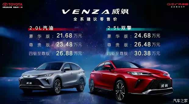 这几年国内的SUV市场打得火热,至此,广汽丰田带来了全新车型:威飒! 车身尺寸4780/1855/1660mm,轴距:2690mm,定位在汉兰达与威兰达之间,所以车辆售价也是在此之间,从21.68万到30.38万,覆盖了六个车型可供选择,其中燃油版三款车型配备2.0L自然吸气发动机,最大功率171匹马力,双擎版为2.5L加电机混合动力,最大功率178匹马力! 外观上:车身线条灵动,显得修长,前大灯和尾灯相呼应,都是细长的流水形设计,尾灯采用当下非常流行的贯穿设计!整体有一种轿跑SUV的跨界风格! 内饰上:虽然设计还是有着很深的家族式设计的影子,但是在用料上简直一改对丰田的固有印象。大面积的软质材料,搭配镀铬装饰亮条,以及双拼色的颜色搭配,整体质感表现非常不错。 重要说的是:威飒的市场覆盖非常广,后期还有可能根据反馈来增加选择车型,目前2.0L车型也有四驱可供选择,双擎动力版本更是将燃油经济型表现到了天花板:官方公布的百公里综合油耗来看,燃油版为5.9L(两驱)/6.5L(四驱),双擎版为4.5L(两驱)/5.0L(四驱)。 总的来说:目前威飒的购买性价比还是很大的,从外观,动力,空间,配置,还有燃油经济性上来讲,都具有非常优秀的表现!