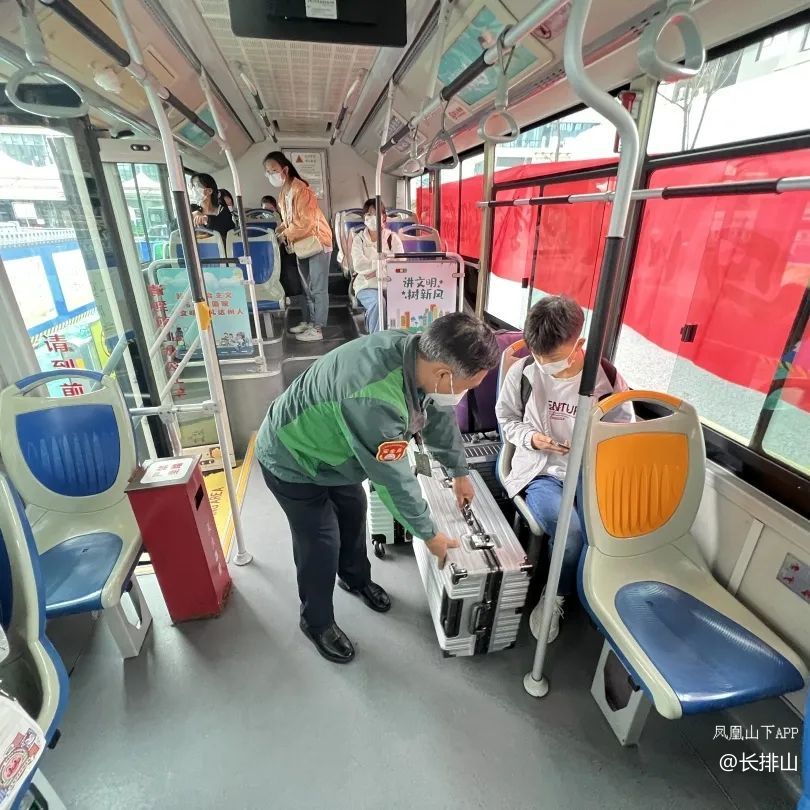 同时也有公交志愿者协助驾驶员查验健康码,核酸检测报告,帮助学生搬运和安置行李等,为确保同学们快速,高效,安全返校,充分利用调度车辆和调整班次"即满即走"循环发车"。