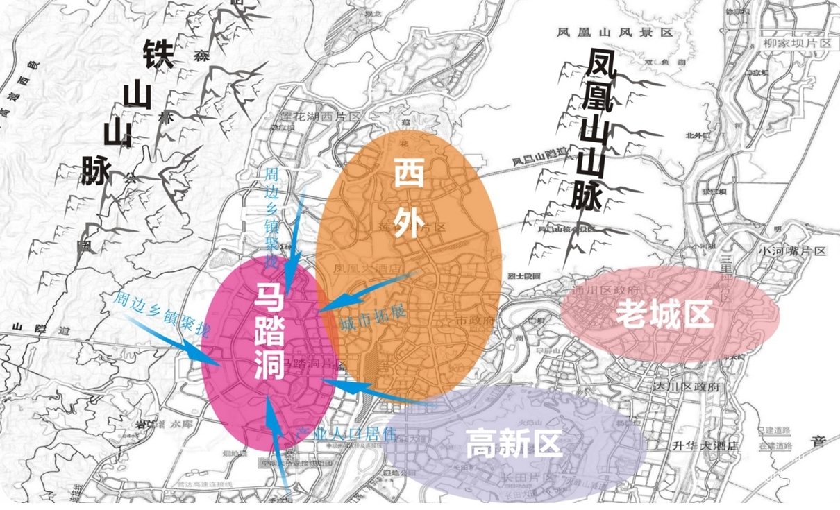 高新区工业发展以及新机场、高铁站的建设,促进产业人口南迁。马踏洞作为达州市“城区发展领航区”“数字金融城市承载区”“生态宜居城市品质区”云集了金融、政务、贸易、教育、康养、休闲为一体的产业集群发展方向,致力打造成为“川东北森林城市”“川东北金融中心”“川东北第一新区”。由此可见,马踏洞发展是大势所趋,马踏洞片区将成为达州城市发展的重要载体,也将是工业人口重要的宜居区。