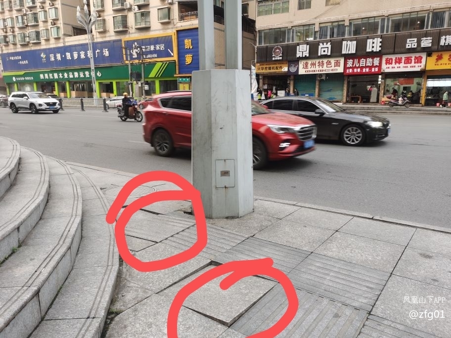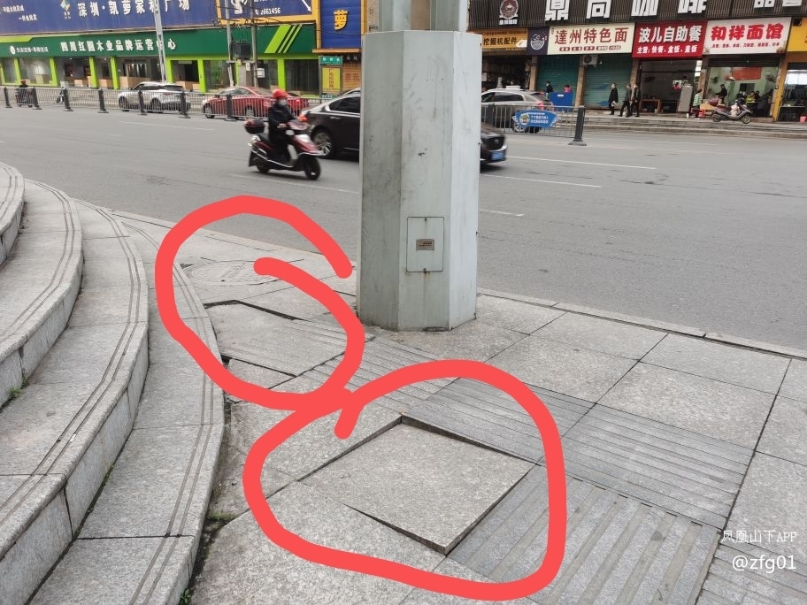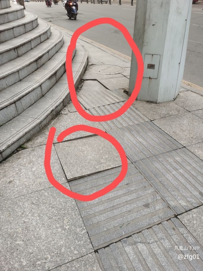 南外红盾公寓左侧边,南方花园对面灯柱下面的人行道,路面地砖坏了几个月了,几块地砖都是活动的,每天都有成百上千的人经过,很不安全。尤其是下雨天,踩下去,便浅得满腿是泥水。