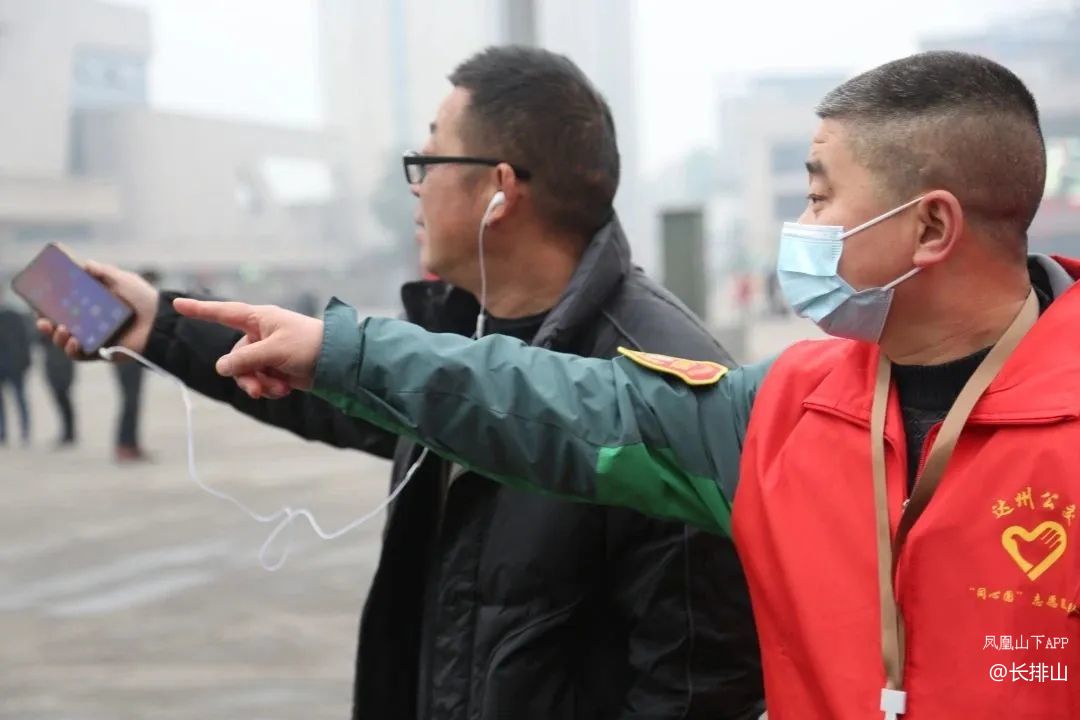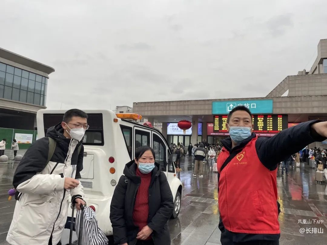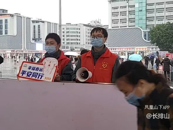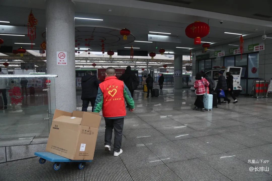 他们一手举起牌子,一手高举喇叭贴心地为他们拎起沉重的包裹,行李,怀抱小孩,搀扶着行动不变的老人,推着轮椅朝站外汽车站走去,并为乘客当起了导游…