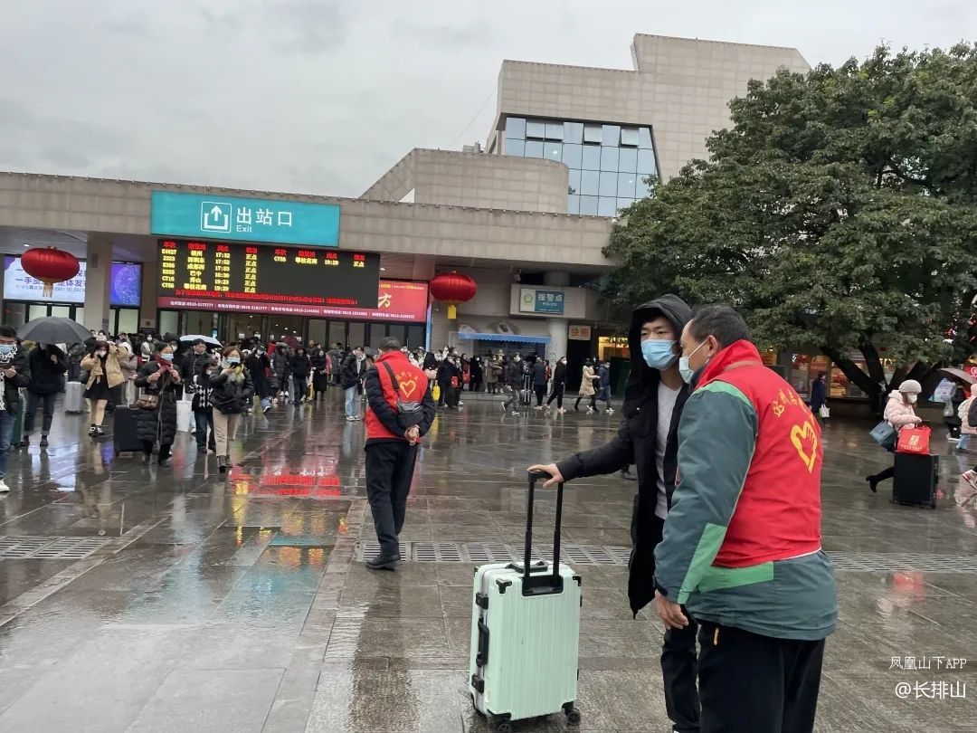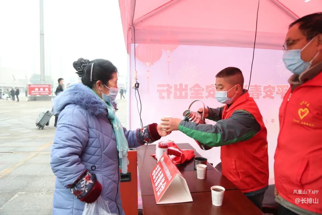 志愿者们还为返乡的乘客倒上一口热水,让乘客取暖,还为归乡乘客指路并接受他们的咨询和帮助,引导乘客进站上车回家。