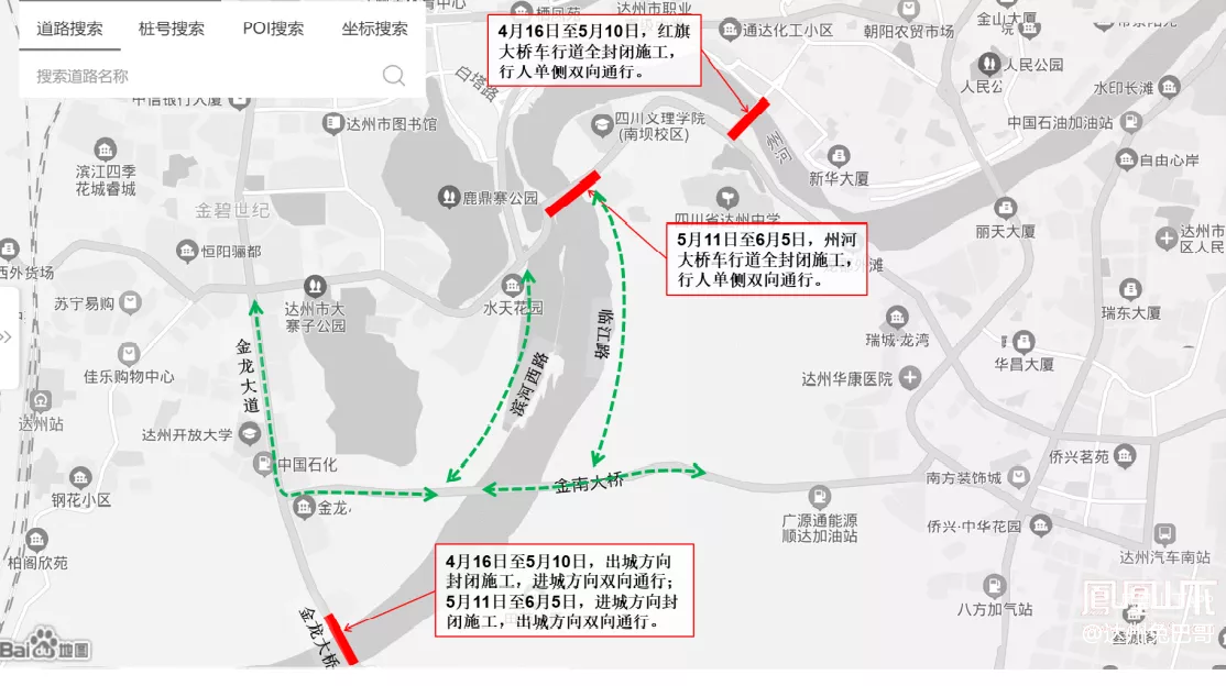 南外往老城区方向:经南滨路三段-州河大桥-朝阳中路绕行;或经达川大道一段-通川大桥绕行。