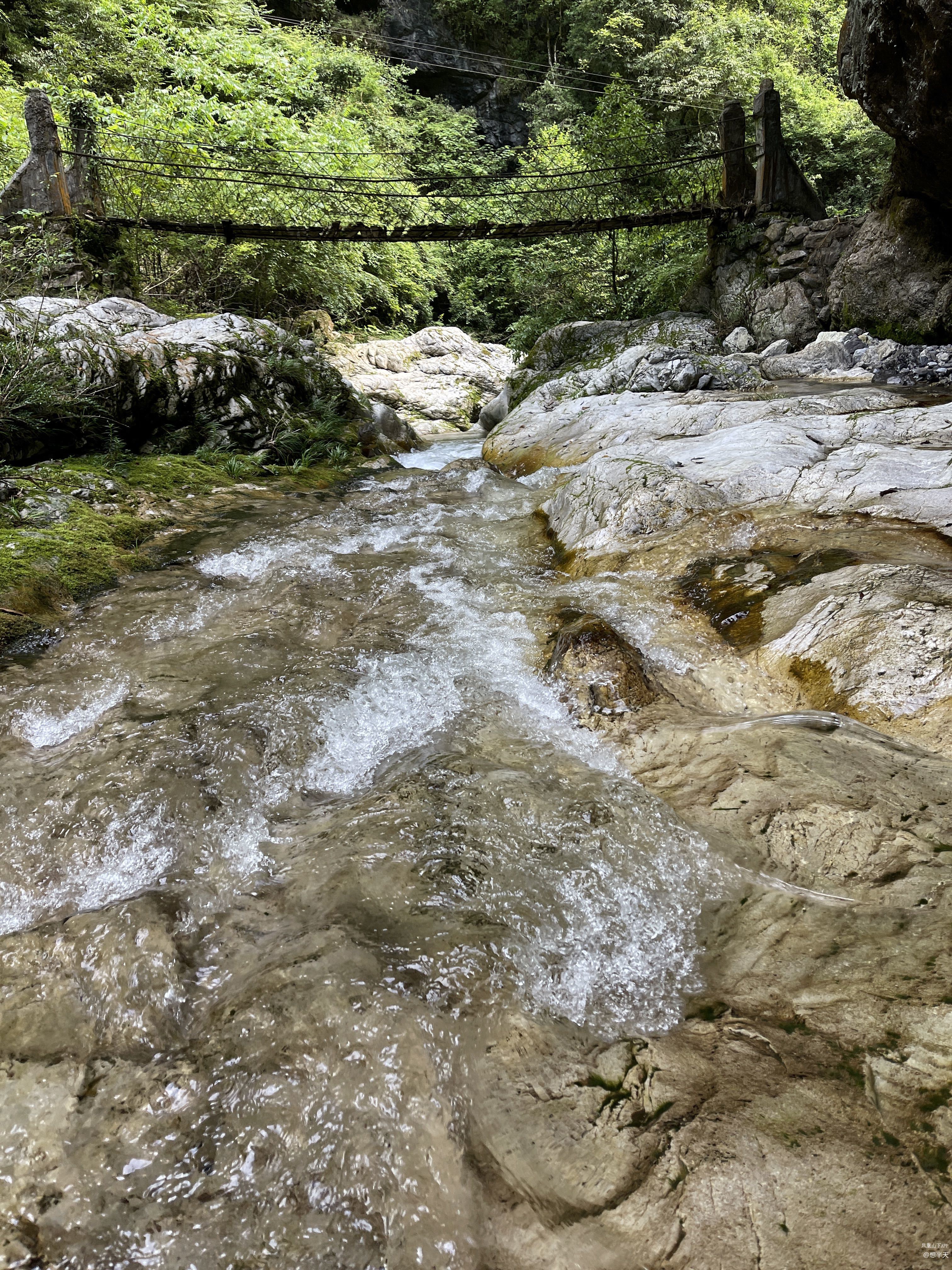 没有人会干涉你不准下水,自己的安全自己负责。这是第一座索桥附近的溪流瀑布。