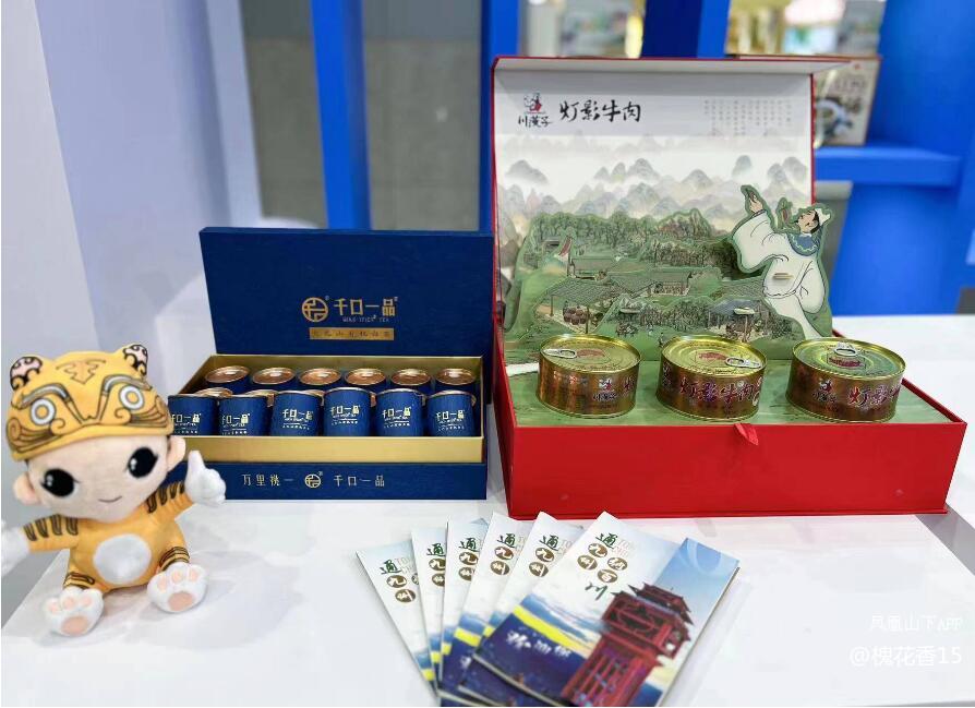 展馆现场井然有序地摆放着通川特色旅游商品川汉子灯影牛肉和千品一品白茶,吸引广大游客前来参观品尝。