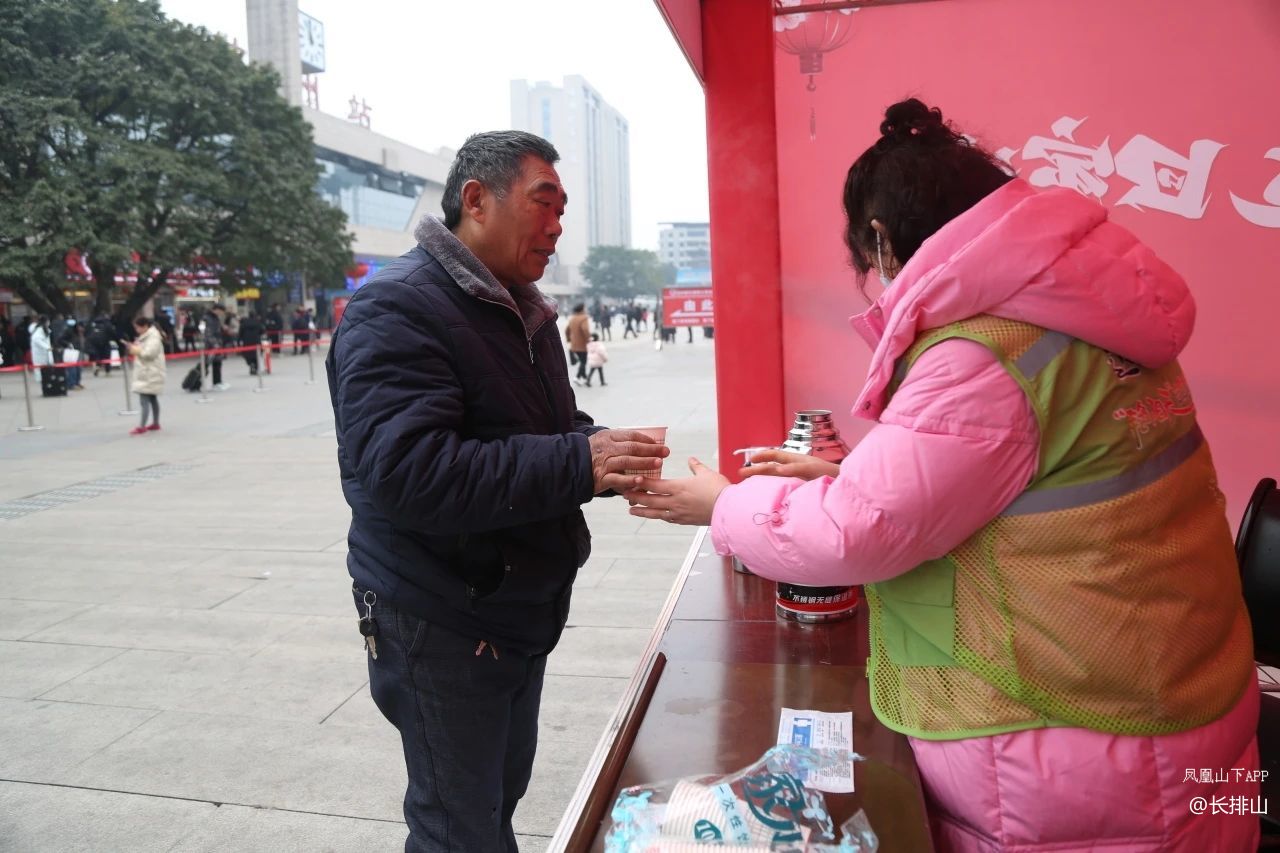 在达州火车站西广场:达州公交志愿者服务点位志愿者们自备开水,药品和取暖设备为来往的乘客服务。