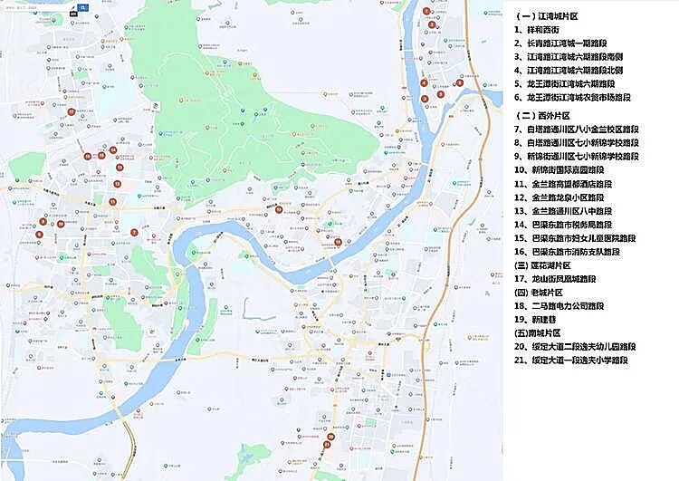 (二)西外片区 7.白塔路通川区八小金兰校区路段 8.白塔路通川区七小新锦学校路段 9.新锦街通川区七小新锦学校路段 10.新锦街国际嘉园路段 11.金兰路高望都酒店路段 12.金兰路龙泉小区路段 13.金兰路通川区八中路段 14.巴渠东路市税务局路段 15.巴渠东路市妇女儿童医院路段 16.巴渠东路市消防支队路段