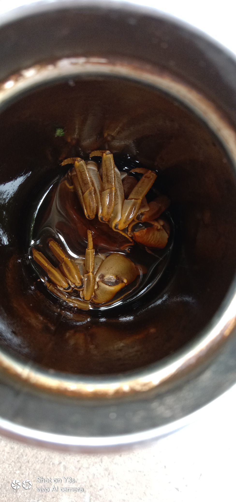 前段时间,饭后出去溜达。行至A门口,看到一个铁盆里爬着一只半大的螃蟹。
