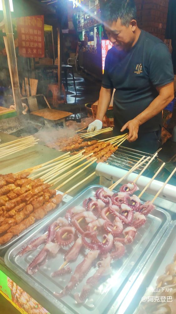 在这里,人潮涌动,欢声笑语与讨价还价声交织在一起,游客们穿梭在各个摊位之间,仿佛置身于一个欢乐的迷宫。琳琅满目的商品,色彩斑斓的傣服,以及一个个初试傣服的俏妹子、俏大妈浓妆淡抹地在闪光灯下风情万种的pose,直把浪漫拉满。还有许许多多专属热带风情的特色小吃,冲刺着味蕾,但俺却不敢轻易尝试那些看不懂的东东。俺横啃一根硕大的羊肉串漫步在人从众中,感觉整个夜市都被繁灯和嚣声烘托起来了,真真成了天上的街市。
