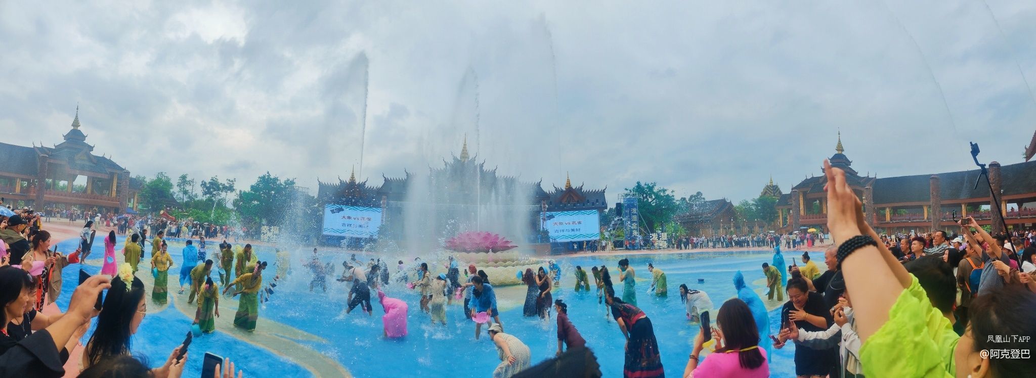 接着,主持人再高炫一波热情洋溢的噪动,著名的傣式蹦迪与嚣叫的音乐声交织成一片,环楼的数门大水炮轰然地射将出来,点燃了全场的沸点。傣家后生引领场中的男女老中幼人从众地涌入水塘,水盆翻处如天女散花,水柱飞溅如珠落玉盘,一个个湿透的身影在朦朦雨雾中翩翩起舞,欢声与笑声回荡在广场的每一个角落。水中无论男女老少,都尽情地泼洒着祝福,每一滴水都承载着美好的期许,整个世界仿佛都沉浸在欢乐与友爱之中。俺虽木有跳入水中共享这沸腾的欢乐,却也被这强大的磁场所感染,不断变幻最佳的视角,咔嚓咔嚓地定格了许多难忘的瞬间。