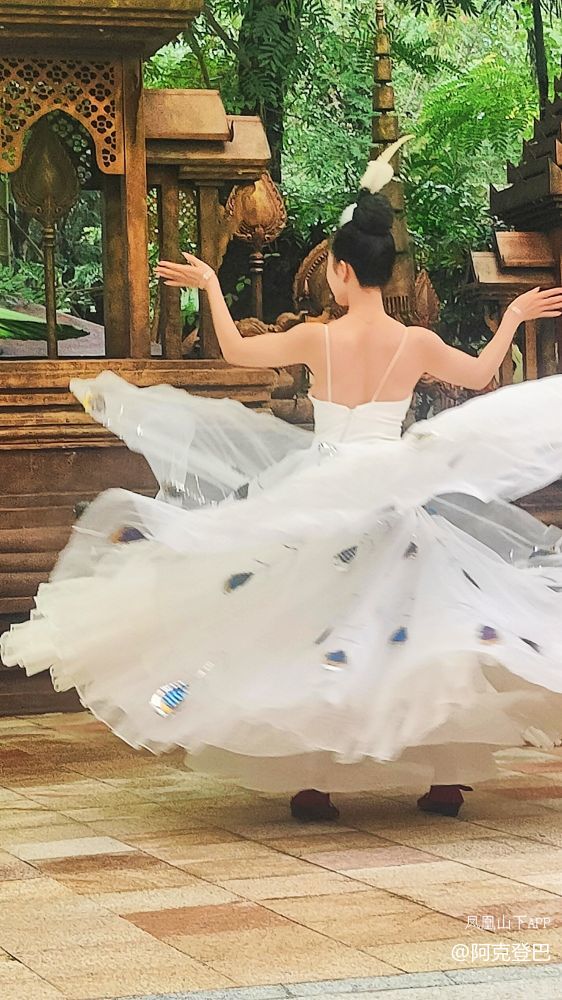 上午11点在孔雀园看孔雀舞表演的时候,雨儿还小猛了一会儿,而孔雀姑娘们依然在台上通过细腻的动作和丰富的表情,精湛地演绎了孔雀优雅的韵味。这,可就比曼听公园和大佛寺做得更好了,曼听即便是小雨都会暂停花车游园,大佛寺遇雨也会暂停泼水活动。而傣族园却非常高调,管行李寄存的大姐之前对我们说,别说下雨,就是下刀,我们也要泼水。吙,这个厉害!