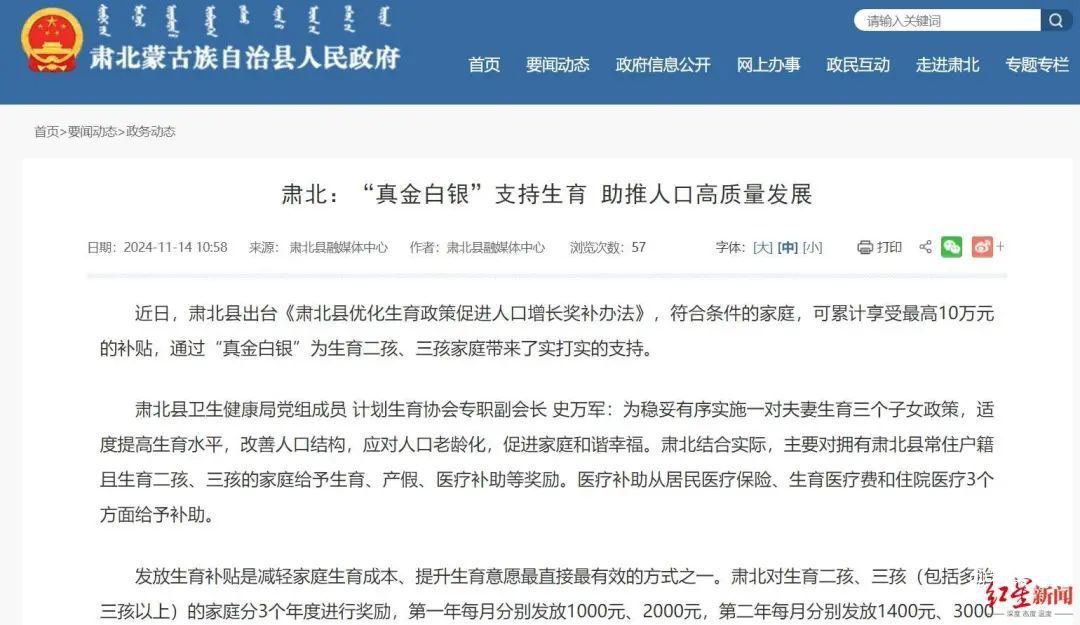 最近,一条“甘肃酒泉市肃北县‘真金白银’奖励生育二孩、三孩家庭”的消息引发众多网友关注。根据当地近日出台的《肃北县优化生育政策促进人口增长奖补办法》,符合条件的家庭可累计享受最高10万元的补贴。据肃北县政府官网肃北县是甘肃省面积最大的县,约占甘肃省总面积的六分之一,全县常住人口只有1.5万人左右。11月18日,红星新闻从当地相关部门获悉,当地近年来生育率下降,去年出现负增长,目前全县平均每月的新生儿出生数量不到5个。据了解,当地目前还处于政策宣传阶段,相关部门尚未收到相关补贴申请,但已经有人咨询奖补政策的具体细节。对二孩、三孩家庭最高补贴10万11月14日,肃北县政府官网发布的一篇文章称,肃北县近日出台《肃北县优化生育政策促进人口增长奖补办法》(下称《奖补办法》),符合条件的家庭可累计享受最高10万元的补贴,通过“真金白银”为生育二孩、三孩家庭带来了实打实的支持。《奖补办法》提到,为稳妥有序实施一对夫妻生育三个子女政策,适度提高生育水平,改善人口结构,应对人口老龄化,促进家庭和谐幸福。肃北结合实际,主要对拥有肃北县常住户籍且生育二孩、三孩的家庭给予生育、产假、医疗补助等奖励。医疗补助从居民医疗保险、生育医疗费和住院医疗3个方面给予补助。发放生育补贴是减轻家庭生育成本、提升生育意愿最直接最有效的方式之一。《奖补办法》还称,肃北对生育二孩、三孩(包括多胎三孩以上)的家庭分3个年度进行奖励,第一年每月分别发放1000元、2000元,第二年每月分别发放1400元、3000元,第三年每月分别发放1700元、3300元。当地月平均新生儿出生数不到5个很多人初听肃北县这个名字会感到陌生。肃北县地处河西走廊西段,是甘肃省唯一的蒙古族自治县、边防县和行政区划为两个独立片区的县,地处祁连山麓余脉,是“丝绸之路”的重要节点县。此外,肃北县还是甘肃省面积最大的县,总面积6.67万平方公里,约占甘肃省总面积的六分之一。据肃北县政府官网信息显示,2023年末全县户籍人口12657人。11月18日,红星新闻从肃北县当地相关部门了解到,肃北全县的常住人口有1.5万人左右,当地出台《奖补办法》主要是考虑到当地人口太少,生育率每年下降,去年出现负增长,就目前的数据来看,全县平均每个月的新生儿出生数量不到5个。据了解,上述政策是今年10月下旬出台的,从印发当天便开始实施。这意味着只要是在该政策出台后出生的新生儿,只要符合条件就可享受相关奖补政策。外地人落户且生育一孩另奖1万元红星新闻注意到,根据《奖补办法》,对生活、工作在肃北县境内,将本人和子女户籍落在该县,自愿生育一孩的,经评估符合条件的另外奖励1万元。红星新闻从当地相关部门获悉,这一条主要是针对非肃北户籍、但在肃北县生活工作、对肃北县经济社会发展有助力的人,其将本人和子女户籍落在该县,自愿生育一孩的,经评估符合条件的可另外奖励1万元。据了解,符合《奖补办法》条件的家庭可以直接向辖区乡镇申请,乡镇再将材料交由上级相关部门进行审批,该政策目前主要还处于宣传阶段,暂没有收到相关申请,不过这几天已有人咨询该政策的具体细节。
