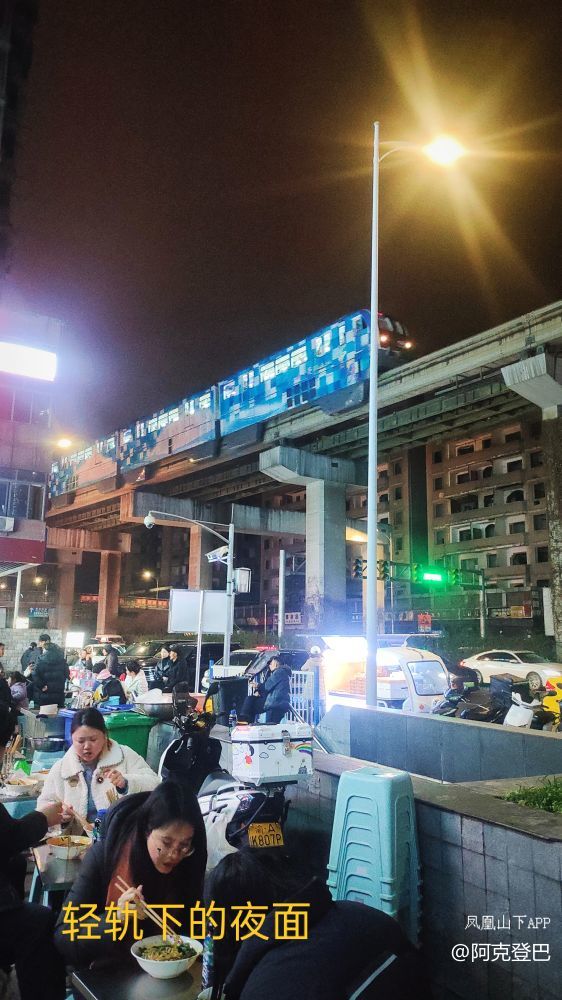 直观看去,乱烘烘毫无装修可言,门外支一台锅煮面,摆一张桌打料,人行道上横贯十几张折叠桌围着一圈圈的塑料板凳,不管杂感觉,都还是一个活脱脱的地摊面嘛。更神奇的是,轻轨就在头顶,每隔几分钟就有蓝色轨道车从天上呼啸而过。在这种场景下吃夜面,还要排队,还要等号,还要自己去端,哦烤,有没有一种老电影里某个桥段中的故事感呢?