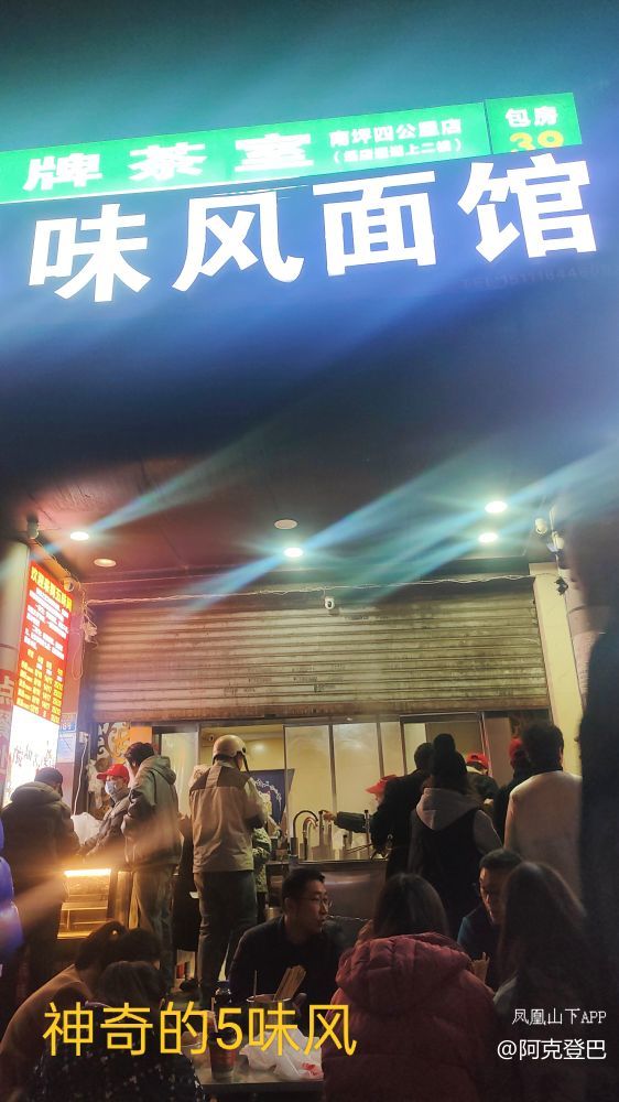 在重庆的小面赛道上有一句言子儿,叫北有四大神兽,南有5味风,可见其分量足矣。这是一家卖夜面的店,说是晚上7点半开卖,凌晨6点收摊。我7点20去已经排起队伍了,俺没搞懂魔力在哪儿?甚至连5味风老板自己都没搞懂。曾见他在抖音上讲: 2017年摆地摊,21年租门店,没得服务,没得环境,不晓得大家是朗个还楞个喜欢我们5味风。