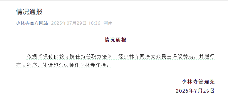 7月29日,据少林寺官方网站:依据《汉传佛教寺院住持任职办法》,经少林寺两序大众民主评议赞成,并履行有关程序,礼请印乐法师任少林寺住持。