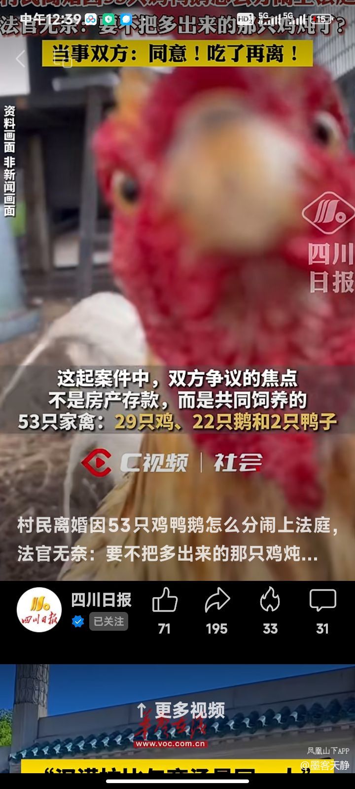 分割的难度在于,家禽大小不均,并且还是单数。最终在法官的调解下,双方同意平均分配后再将单出的一只鸡作为散伙饭煮了一起吃。