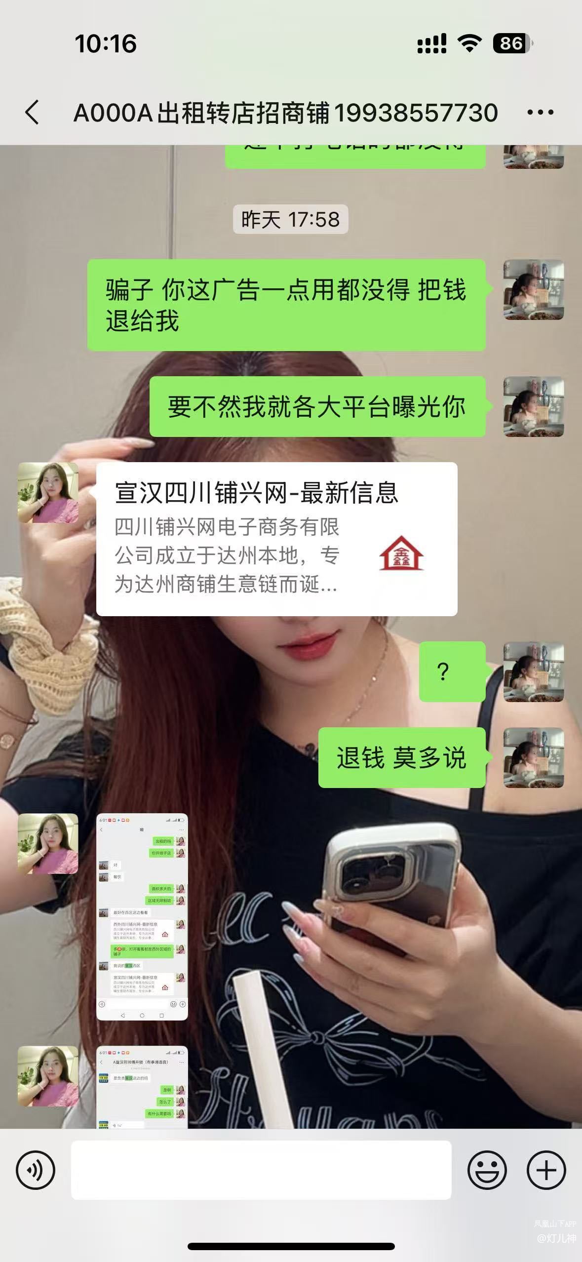 本人在宣汉公园城开了一家烧烤大排档,因多方面原因想将店转出来,于是在58同城上面发布了转店信息,立马就有很多中介平台打电话过来叫我们在他们那里打广告,其中有一家就是《四川铺兴网》,彭娟当时介绍自己公司的时候各种夸大其词,声称自己就是公司股东和法人,几乎全达州的店都是她转让出去的,并把其他各个中介平台诋毁的一文不值,没有合作之前天天联系我,信誓旦旦的承诺几天就可以把店转出去,由于心急转店我就信了她的鬼话,在7月17号给她付了300元钱所谓的广告费,她把钱收了后就前后判若两人,后面一直没接到过找店的电话,就合作当天在网上看到了一下广告,后面就再没看到过广告了,找她问转店的事的也是爱搭不理,直接拉黑!所以像这种骗子公司我必须曝光出来,以免其他同行上当受骗!请记住这个公司这个名字《四川铺兴网》(彭娟)!!!