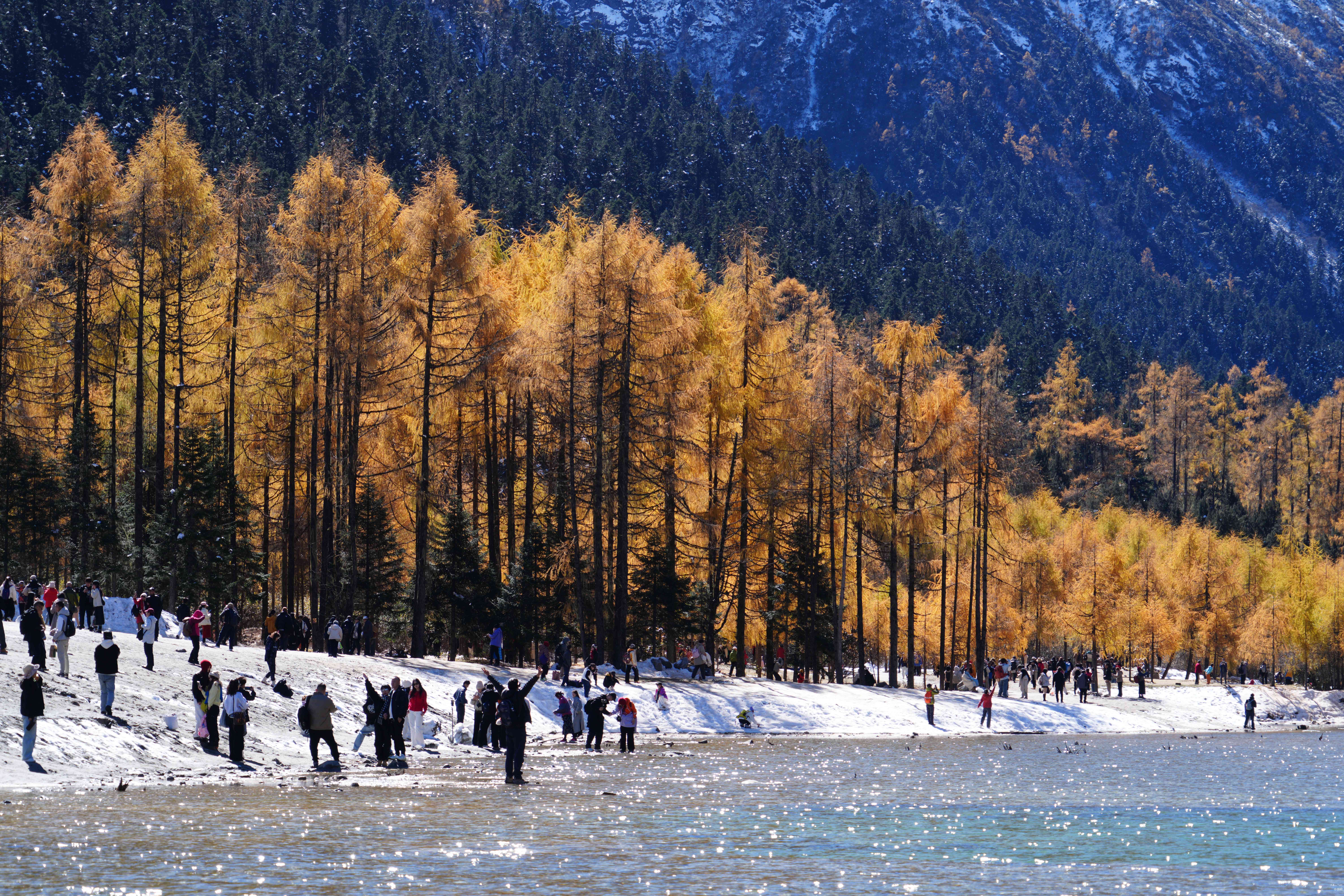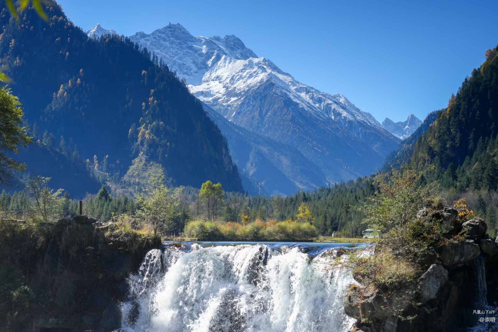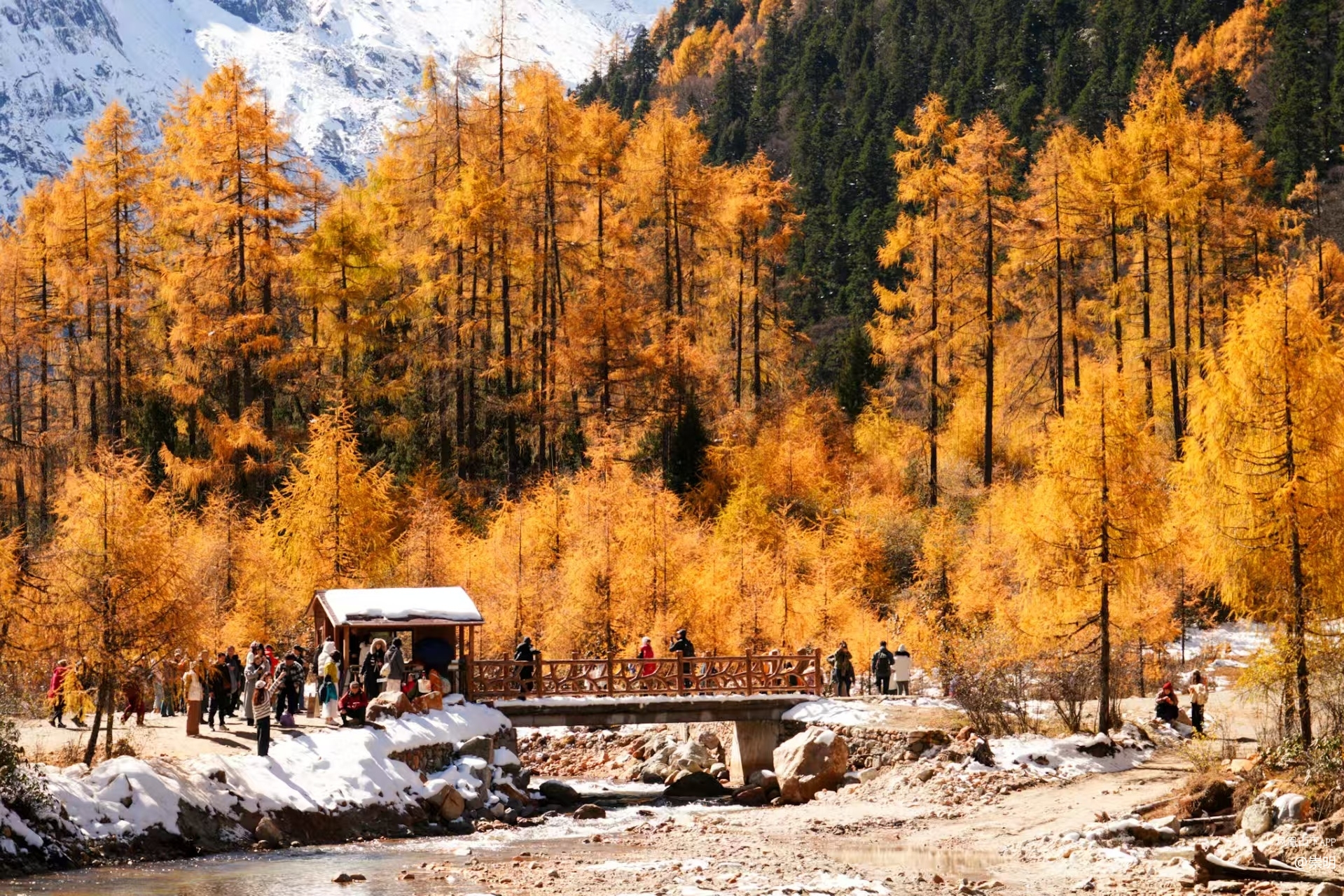 毕棚沟已切换至「秋日高饱和模式」,彩林草甸、巍峨雪山、海子瀑布…脚步所至,秋色蔓延目光所及,皆是金黄