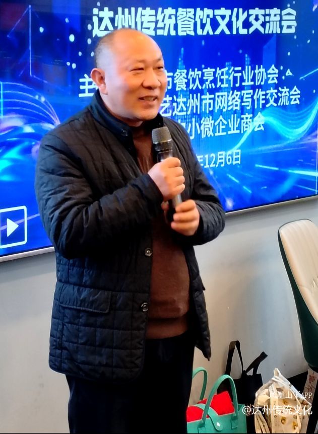 接着是李开成、范藻、邓高、刘国唐、王贤明、覃明翀、王中诠等来宾从不同角度讲评了这次交流活动的重要意义及对弘扬中华优秀传统文化的餐饮文化有积极的引导作用。在王中诠已撰写的《荔枝古道的视野》提纲,他希望能把达州特色名吃全部写入之内,并希望由传促会牵头,达州市餐饮烹饪行业协会、达州市中小微企业商会、新文艺达州市网络写作交流会共同努力对达州酒楼、饭店、火锅、面店、小吃、素食等各评出有档次,色香味型俱全的名店,让外地来达州的客人都能品赏达州美味,永远忘不了达州特色。