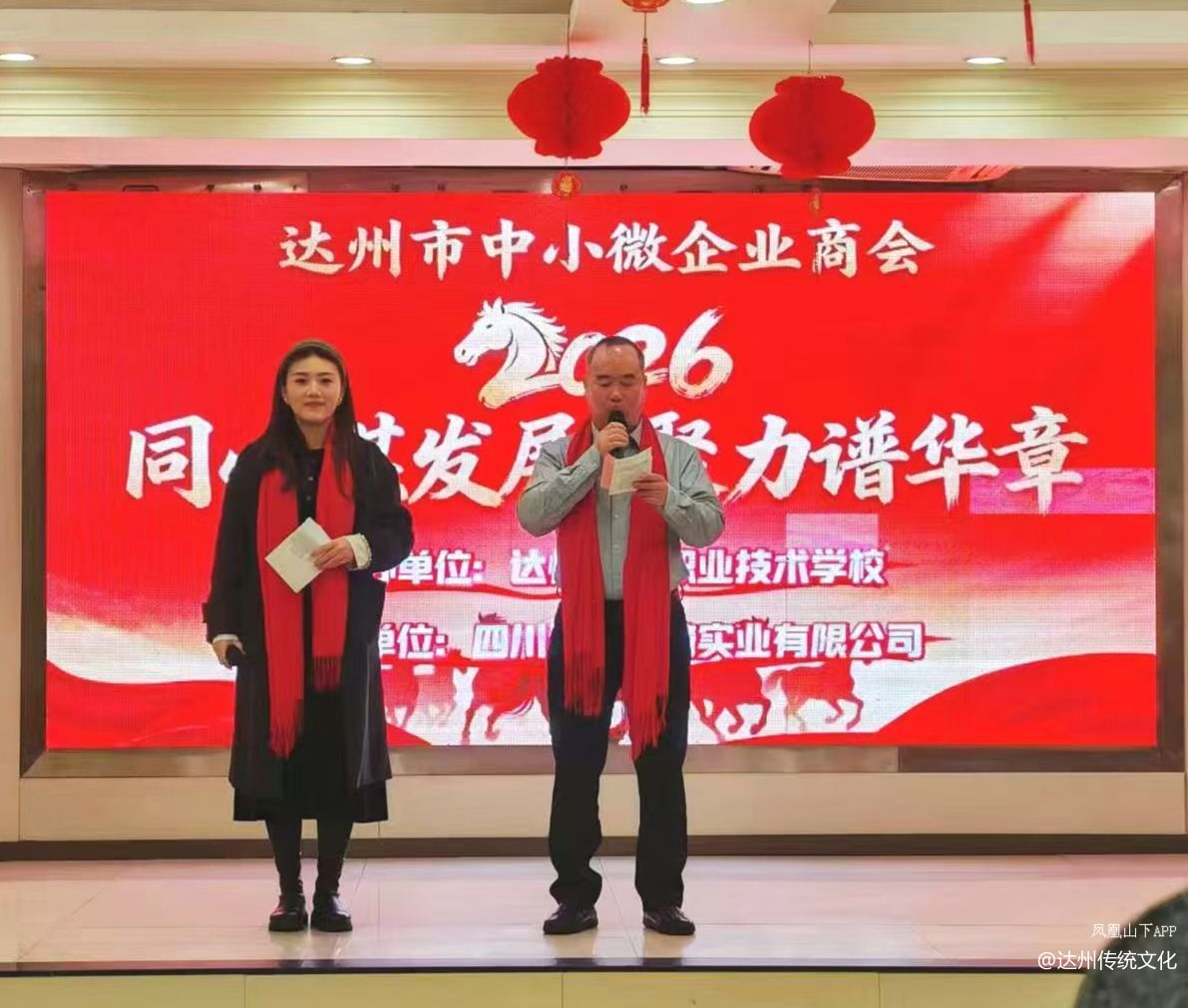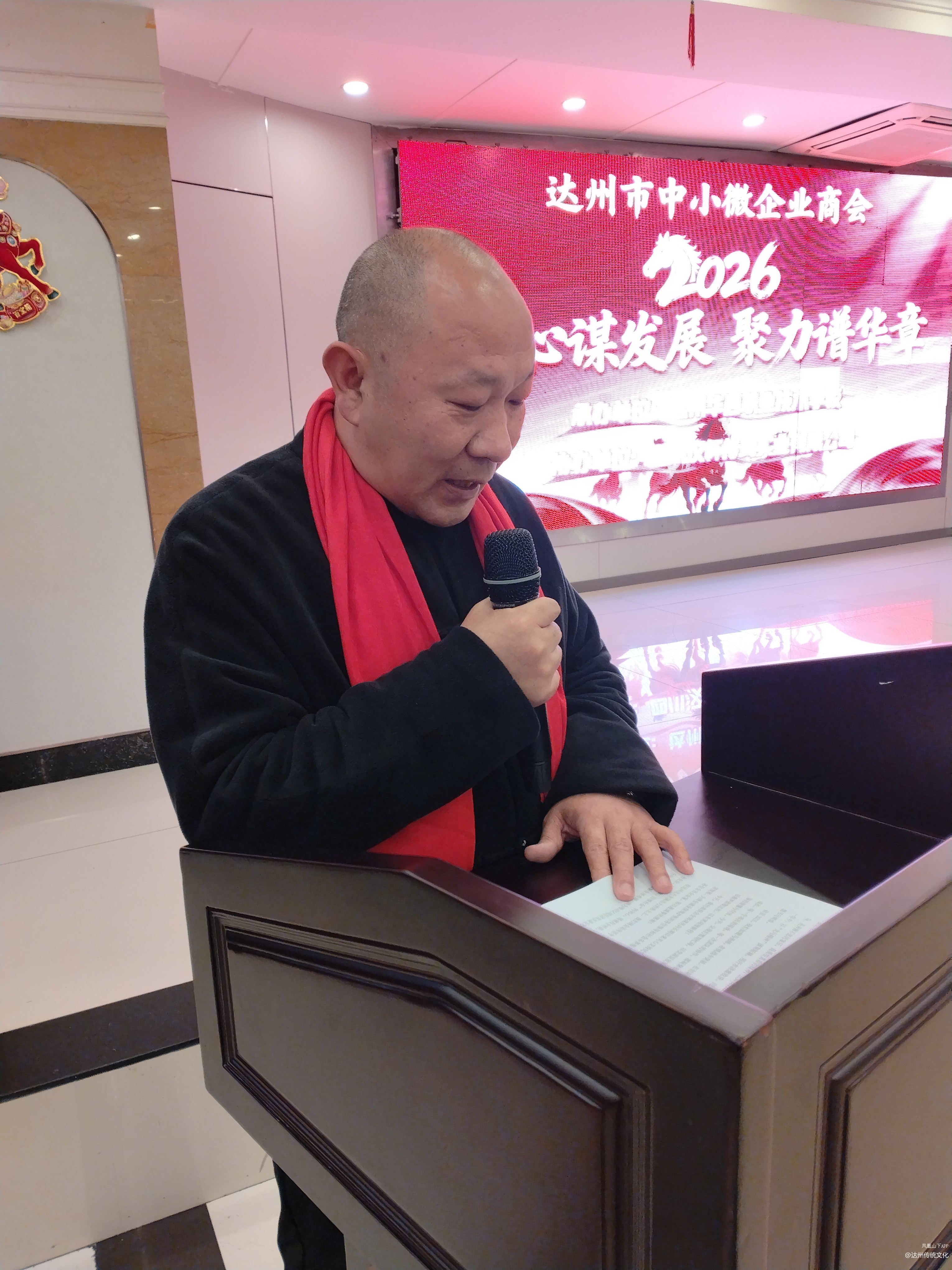 市中小微企业商会会长、市传统文化促进会执行会长李涛介绍说:金蛇辞旧岁,骏马踏春来!马,是奔腾不息的象征,是勇往直前的精神,正如过去一年,我们以“龙马精神”披荆斩棘,用智慧书写成功,用汗水浇铸辉煌。在达州这片充满活力的热土上,商会始终坚守“服务企业、赋能发展、回馈社会”的初心,搭建政企桥梁、整合优质资源、破解发展难题,成为推动区域经济高质量发展的重要力量。我们商会始终与会员企业同心同向、并肩前行,在探索中成长,在实干中精进,获得全国“四好”商会的殊荣。