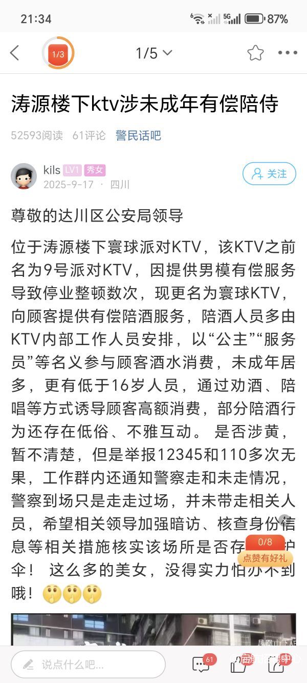 最开始的《九号派对》,然后《环球派对》到现在的《欢畅party.k》!在之前下面这个帖子发出来之后《环球派对》因有未成年偿陪侍被查封关停以及相关人员负刑事责任。关门三四个月到现在重新开业而且就是之前举报《环球派对》那一批人接过来重新营业的。现在想想肯定是因为利益关系故意举报然后自己坐收渔翁之利。之前的该关的关,该抓的抓,这次我又看看达川区的领导如何来处理这事。除非它改成量贩,否则我就随时打电话,凤凰山下发帖子,我就看看他们关系后天有多硬,能把别人举报关门进去了然后自己来做的好好的。