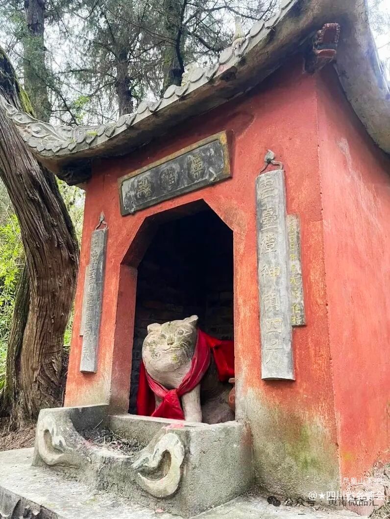 由现在新修的正大门步行到云台观正殿需要走两公里的山路,路面全都由青石铺成且十分宽阔。道路两边修建着各种殿宇,有文昌殿、三官殿、送子娘娘殿、谭猫殿等。其中最吸引眼球的莫过于谭猫殿,该建筑采用正方形平面布局,庑殿顶结构,正门为整石雕刻的圭形门。殿内供奉蹲卧石雕猫像一尊,侧有石桌摆放刻有“云台坛神”字样的石皿,门楣悬挂“谭猫殿”匾额,两侧楹联书“玉猫云台显威灵,云台谭猫震四方”。经过求证,中国奇谭中的谭猫庙原型就是这里。